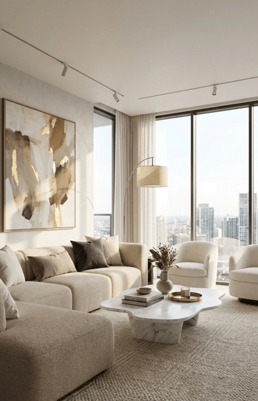 A cozy apartment always begins with a calming color palette. Warm neutrals like soft beige, warm taupe, creamy whites, and muted greige create a soothing base that reflects light beautifully while still feeling intimate.