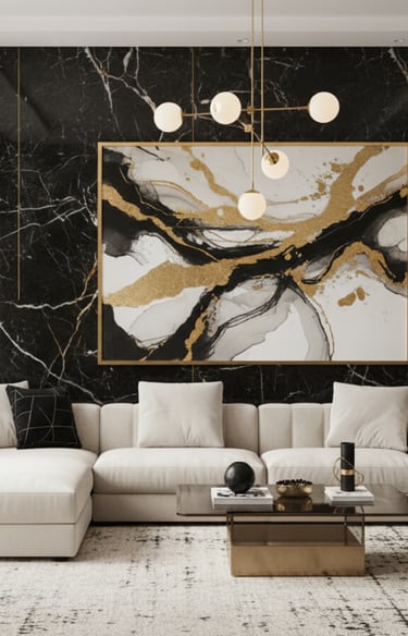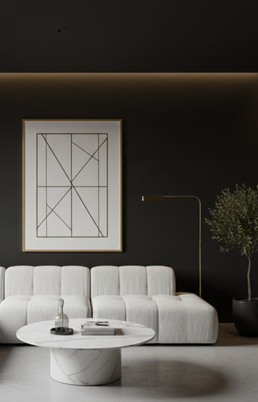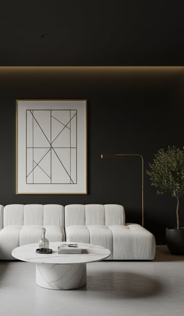 A Deep Leather Sofa, a Marble-Topped Side Table, or a Dark Walnut Media Console can instantly ground the space. Stick to a cohesive palette with just one or two standout materials for a polished look.