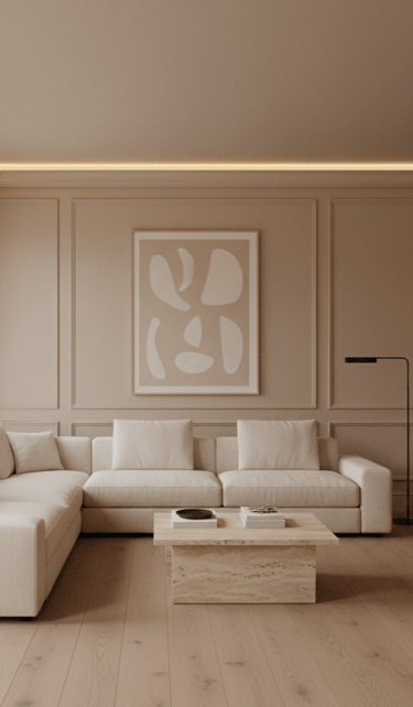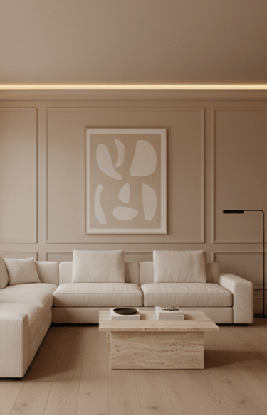 Small variations in tone add richness without clutter. A cream sofa against a slightly warmer wall, layered with a stone-colored rug and a caramel leather accent chair, creates depth that feels subtle and sophisticated.