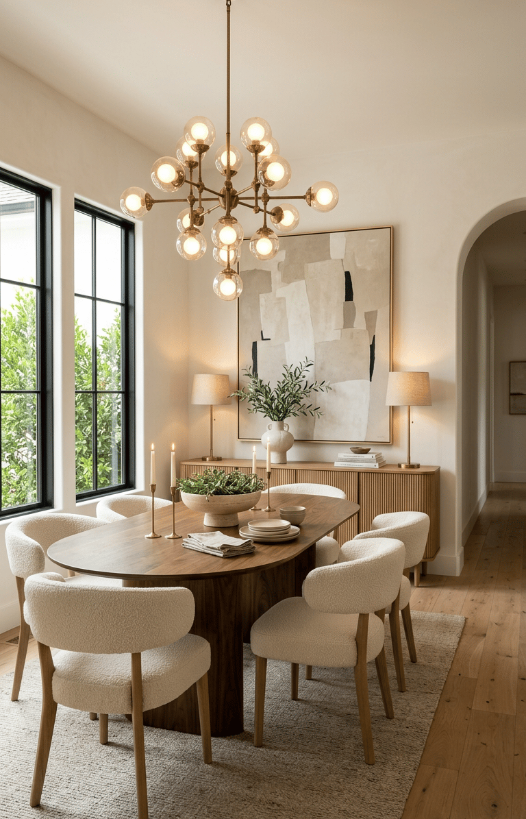 The most beautiful warm modern dining room ideas usually have one thing in common: they balance simplicity with softness. Think matte wood finishes, textured upholstery, sculptural lighting, layered textiles, and a glow that feels more candlelit dinner than showroom floor.